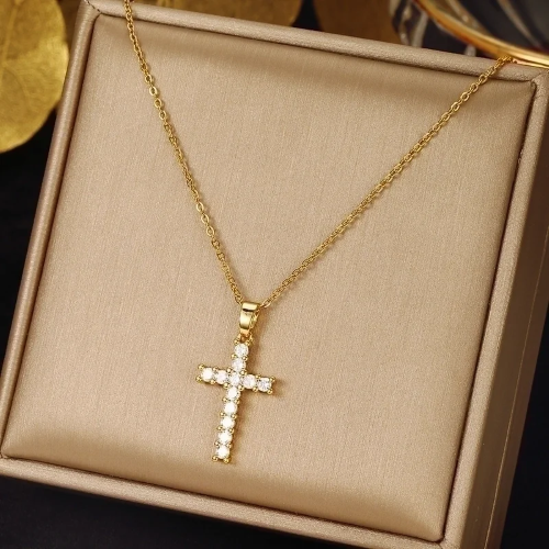 COLLANA CON CIONDOLO A FORMA DI CROCE ACCIAIO INOSSIDABILE COLORE ORO E ZIRCONI